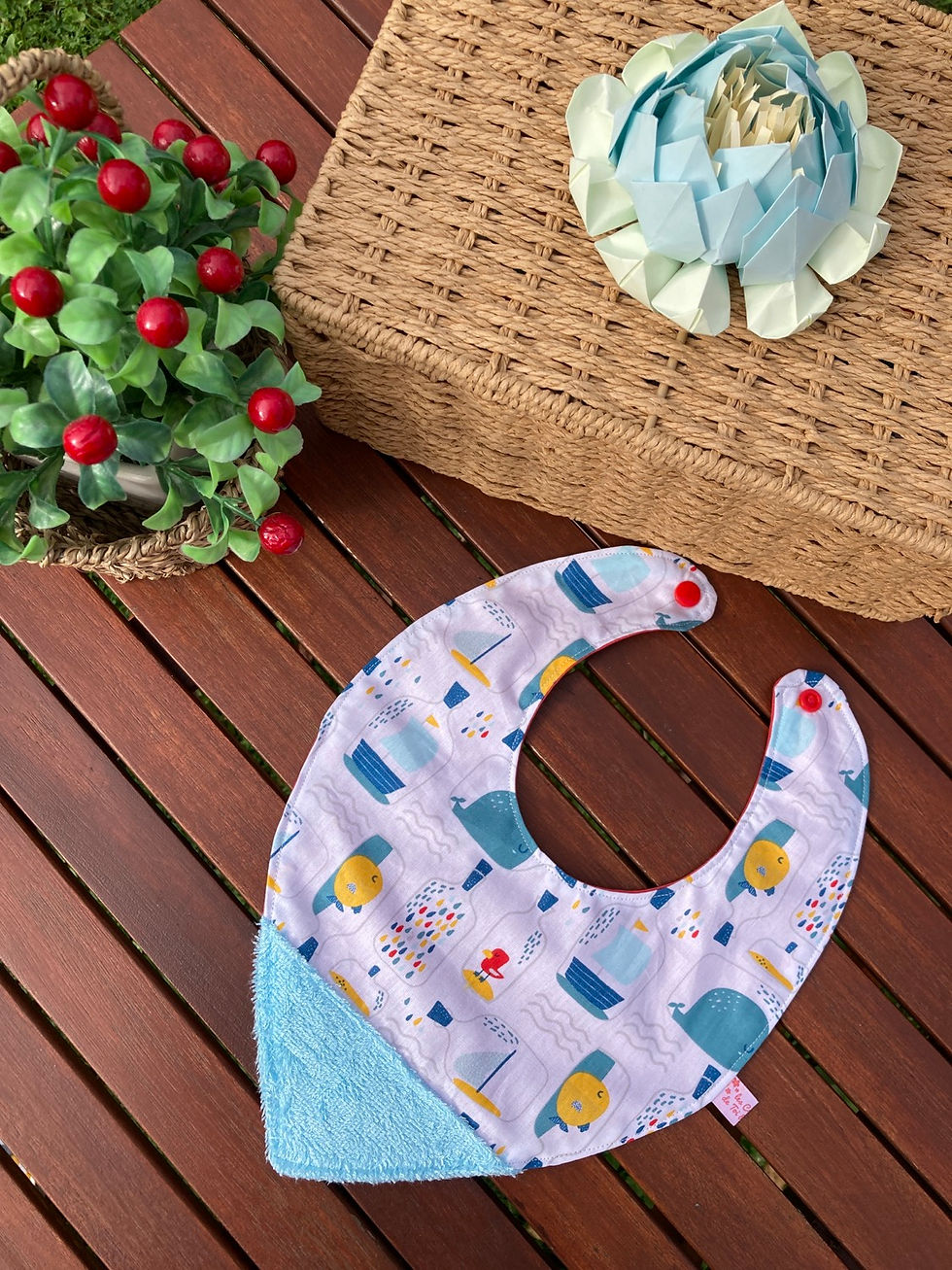 Le réservoir est amovible grâce à un système de pressions, ce qui rend ce bavoir très facile à nettoyer après les repas. Tu peux choisir les coloris du tissu coton à motif pour égayer les repas ! Il sera assorti avec un tissu imperméable uni ultra joyeux.