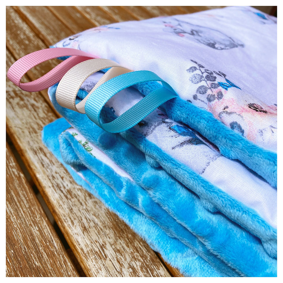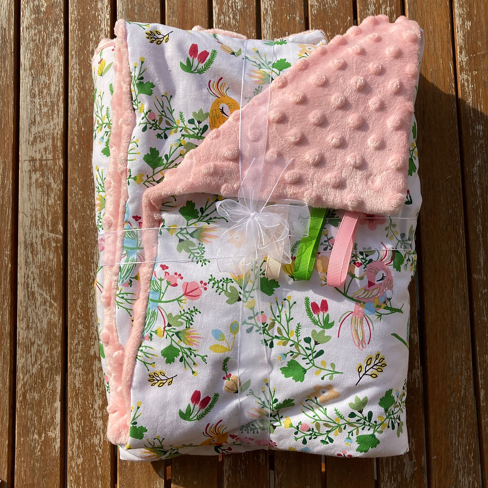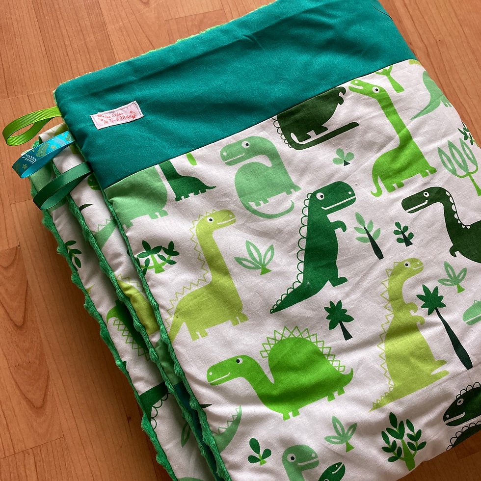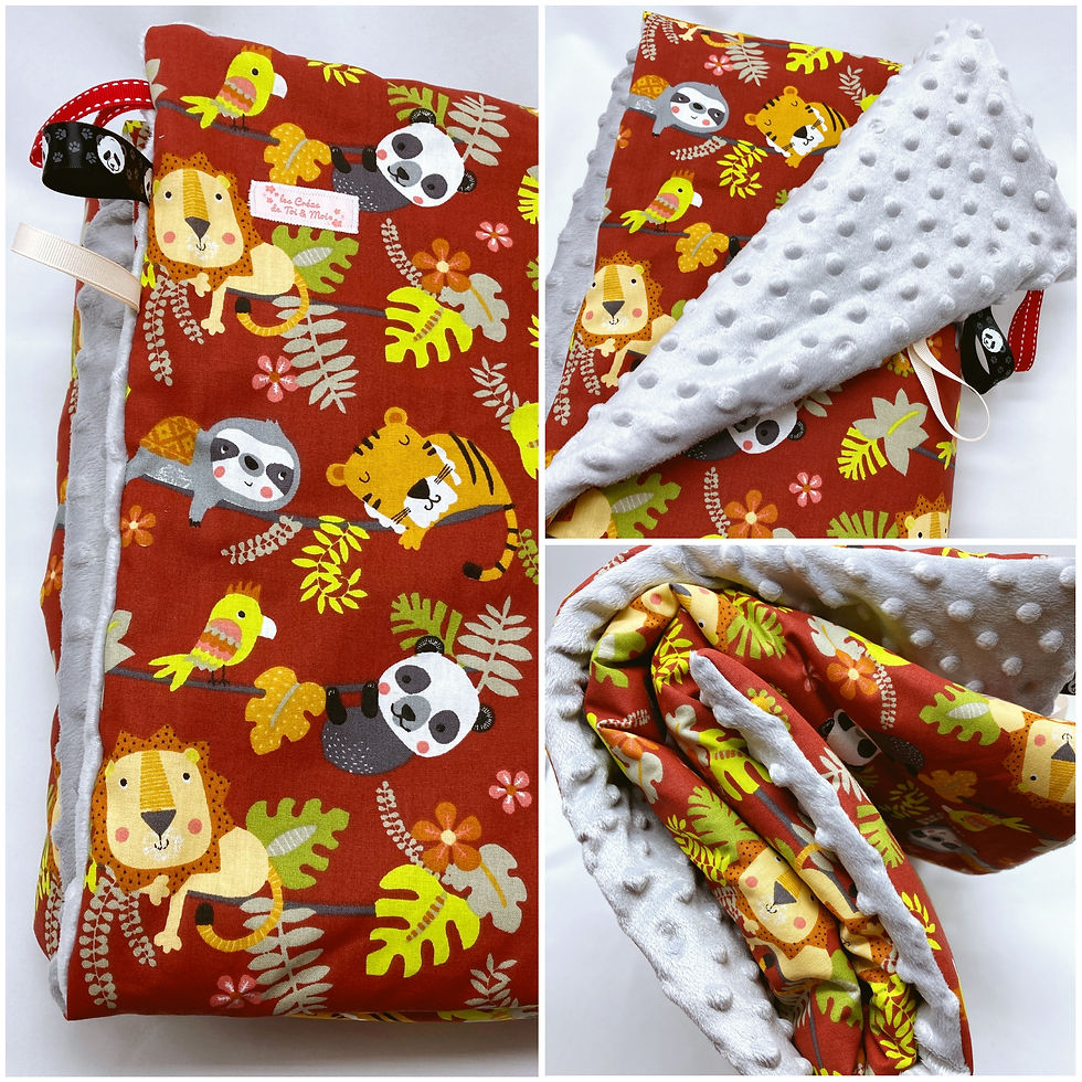 Elle a un côté tout doux que les doigts adorent toucher (et je ne te parle même pas des joues qui en raffolent !) et un côté en coton imprimé au motif souhaité. Il est également possible d'en réaliser avec des bandes de motifs différents, ou des carrés par exemple (effet patchwork).