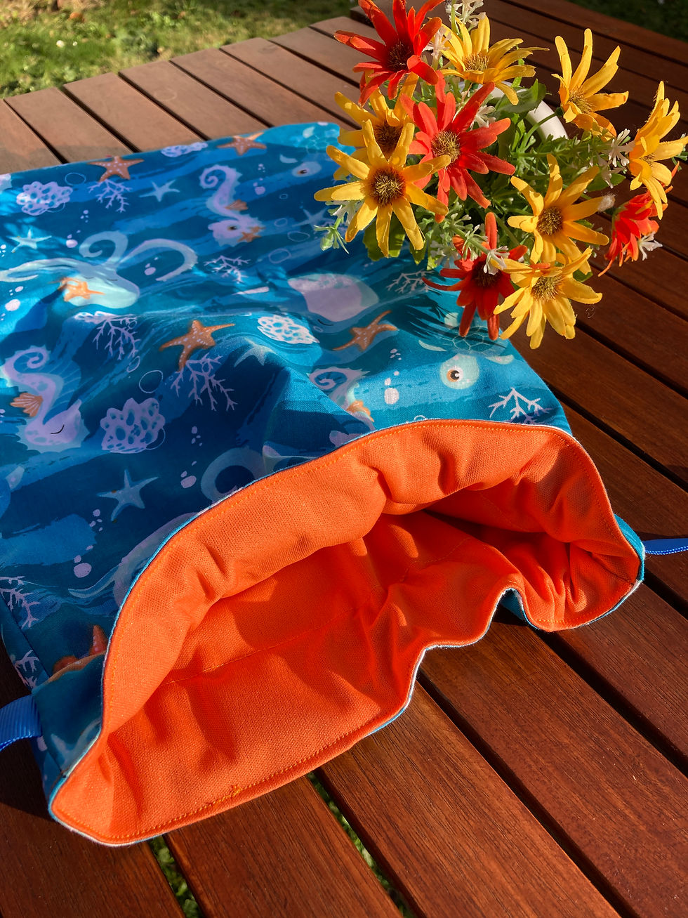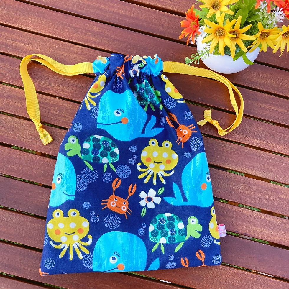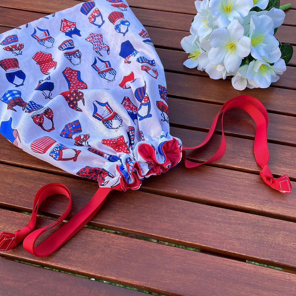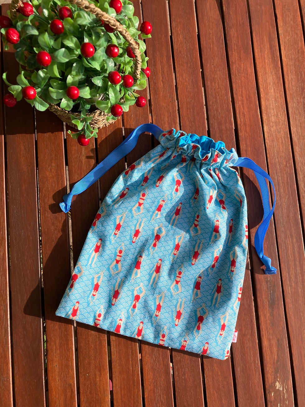 Ce sac imperméable est idéal pour les personnes allant à la piscine et qui souhaitent garder leurs affaires mouillées loin de celles devant rester au sec ! Tu as la possibilité de choisir la dimension de ton sac ainsi que les motifs, et les couleurs du tissu uni et des rubans.